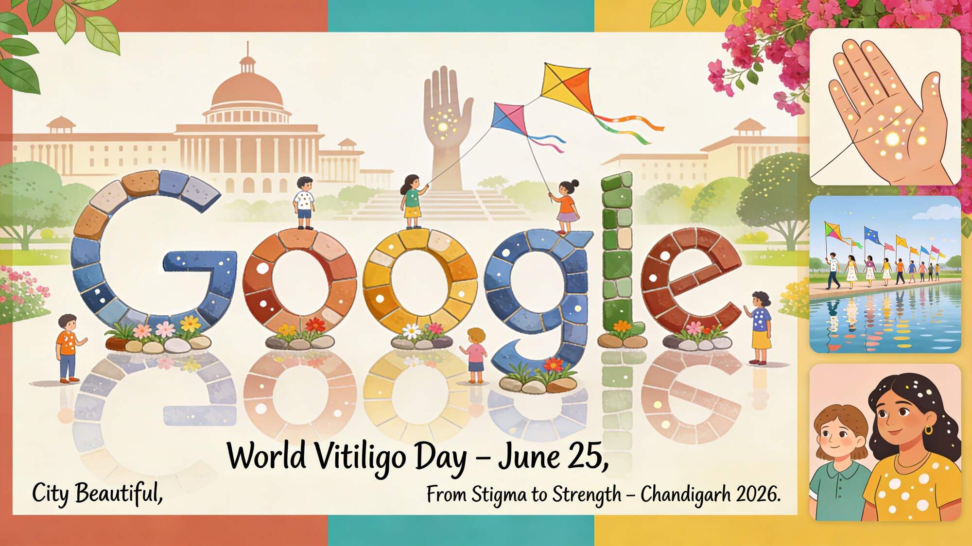 We envision a Doodle that incorporates the iconic architecture of Chandigarh with the vibrant, dappled beauty of vitiligo skin patterns — a celebration of a “Canvas for 100 Million.”